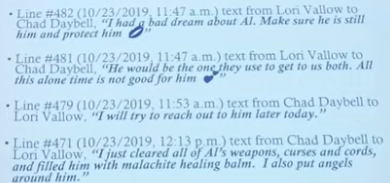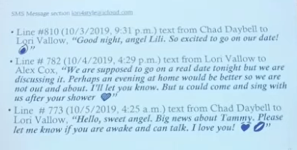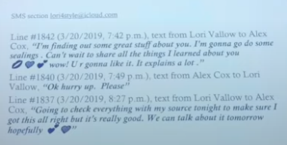 8:59 am: The exhibit is a slideshow, the first slide documents messages from Lori Vallow to Alex Cox.