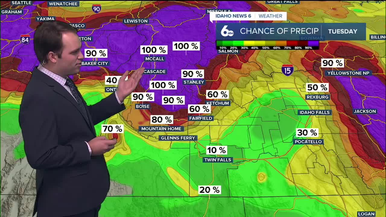 A strong, moisture-rich atmospheric river is impacting the Pacific Northwest and funneling warm air straight into Idaho. Because of that, snow levels are rising rapidly, meaning most of the precipitation this week will fall as rain — even across the mountains. Snow will mainly be limited to the highest elevations above 7,000 to 8,000 feet, and even there, any snow that does fall will be heavy and wet. A warm front moves through this evening, helping showers become more widespread from northwest to southeast. Rain first develops in the central mountains late this morning, then reaches the Treasure Valley by this evening, near 6 PM.