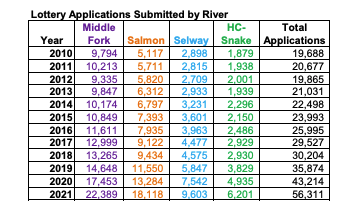 But your odds of pulling one of these permits isn't very good: Hells Canyon offers the best odds, in 2020 it was one in 17, the Main Salmon is one in 43, the Middle Fork is one in 45 and the Selway is one in 122.