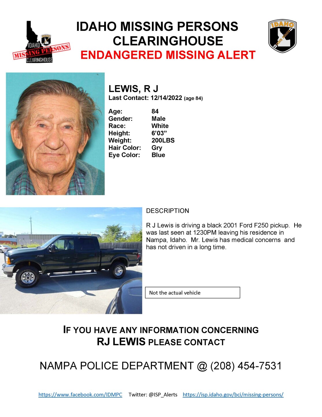 Idaho State Police are looking for missing and endangered 84-year-old white male, RJ Lewis.