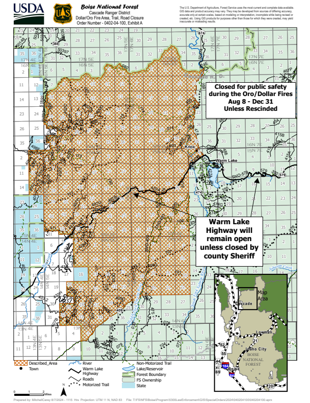 The Valley County Sheriff's Office says anyone who remains in the area should be prepared for a full closure of the Warm Lake Highway and have enough fuel to exit the area via the Deadwood area or Lick Creek Road.