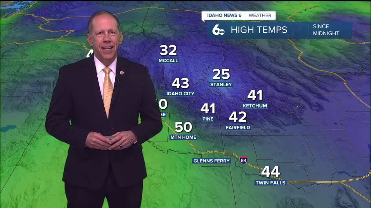 With southerly flow aloft, Monday temperatures will run 10 to 15 degrees above normal, keeping snow levels elevated at 4,500 to 6,000 feet Monday afternoon and evening. However, the current forecast carries 1 to 5 inches of snow in mountain valleys above 4,000 feet, and 6 to 12 inches above 6,000 feet from Monday 5 p.m. through Tuesday 5 p.m., with locally higher amounts along peaks. This could create hazardous travel conditions on mountain routes, especially along passes where winds may gust up to 30 mph across higher terrain. Lower valley locations will generally see 0.10 to 0.25 inches of rain during this same period.