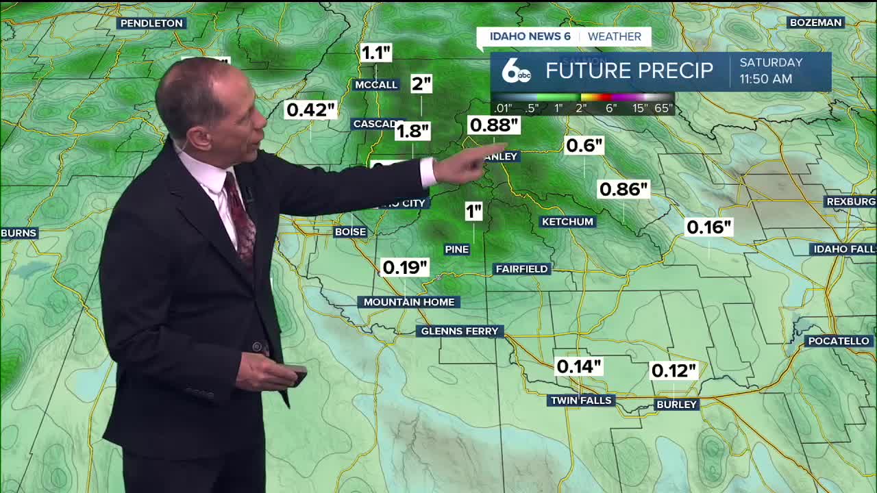Friday brings another round of mountain precipitation as a weak trough moves over the region. Snow levels will drop to 5,000 to 6,000 feet, bringing snow to populated mountain areas Friday evening. McCall could see a dusting of snow, while Banner Summit may receive up to 2 inches.