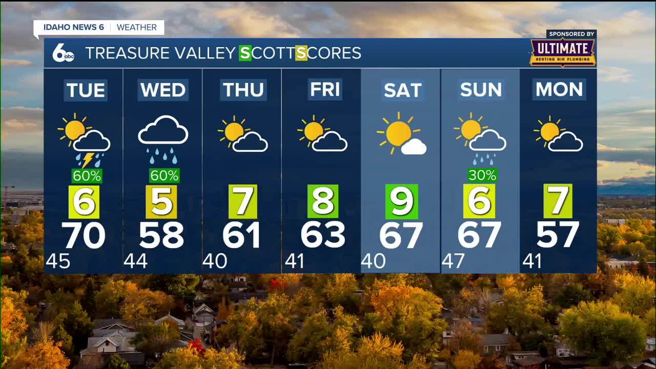 The Treasure Valley will see another round of wet weather as a closed low-pressure system tracks through the region. Tonight brings a 30% chance of showers, mainly after midnight, with mostly cloudy skies and lows around 43 degrees.